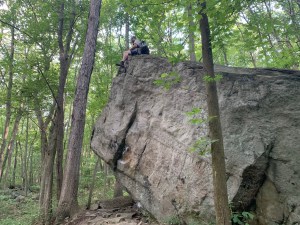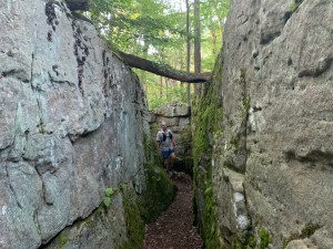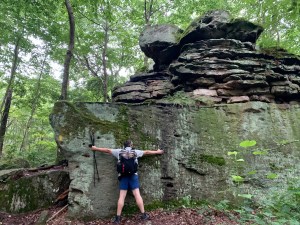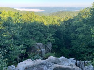5:30 a.m. came around and we leapt up to greet the trail despite the lack of sleep. We were a bit nervous about water sources for the day and took advantage of an unknown trail angel who dropped some water bottles off at the LHHT intersection with the connector trail, which we had spotted the evening before. Once on the trail in our hiking groove, Tarzan was moving a bit faster than me but happy to stop along the way to let me catch up. Otherwise, I wouldn’t have seen him until camp each day. The ridge forest of the trail was a feast of fascinating sandstone rock formations, an expansive open fern understory decorated with sassafras and young bushes, and a wide-range of mature trees, including several oak and maple species, beech, and the towering tulip poplar. There was also the occasional ash, Cucumber magnolia, hickory, and young American chestnut (the latter destined to die as it grew thanks to the blight), as well as thickets of hemlock, rhododendron, and mountain laurel. It was all second/third/or even fourth growth forest, with some logging still going on in the area, but it was well-maintained and forested at this point in time. The trail itself was clear and well-marked throughout. Thanks DCNR!