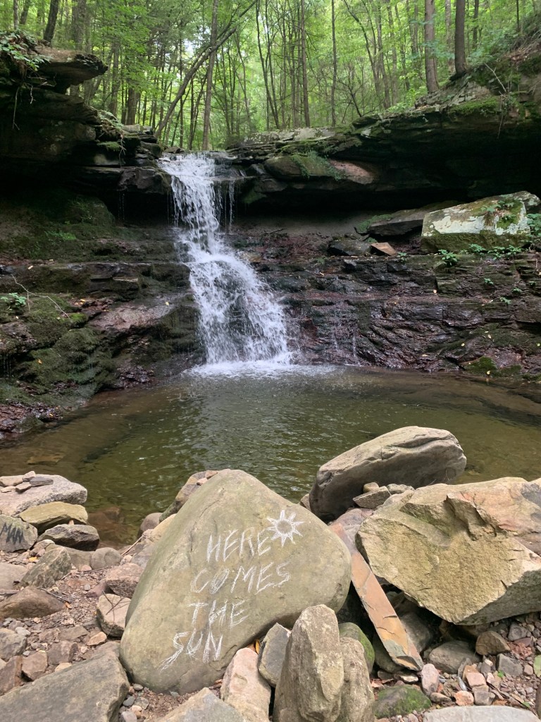 As noted, I was up again early and hiking before the sun at 6:00 a.m. There was light soon enough that I could make my way through the pavilions of World’s End State Park without an issue. Once over Loyalsock creek and the lowest spot of the trail, I picked my way up the rocks up toward High Rock Vista and was glad I made the decision not to attempt this exhausted and in the dark. I hiked on in the morning, soaking in the views and reveling in the hemlocks that made this part of the trail really special. I saw another couple incredible waterfalls and surprised a few campers emerging from their tents in the morning as I strolled past. By the time I hit the Sones area, I was so absolutely smitten with the Loyalsock Trail I was actively planning how and when I could come back. There is just too much beauty and history out here. I called and wished my wife a happy anniversary while imagining us camping among the hemlocks on the banks of scenic Sones Pond. As I completed the trail along the creek, enjoying both hemlocks and rapids in the water, as well as a stretch of pleasant railroad grade trail, I was already regretting doing the trail in such a tight timeframe. I hugged the tree for mile marker 59 and signed my final trail register at 1:00 p.m.