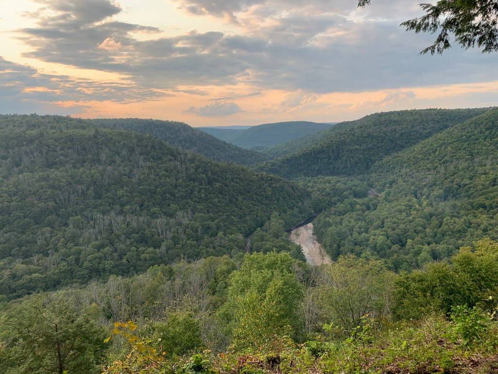 I made it to the expansive views and purple hued skies of the Loyalsock Canyon Vista at about 20 miles for the day around 6:45 p.m. and thought about having an early dinner to keep up my energy for a hike into the evening. The view was excellent and I reminisced about hitchhiking from here in 2010 during my failed outing. This was the exact spot where my previous attempt had ended in ignominy. But there was a bunch of folks at the overlook heatedly debating presidential politics and I just couldn’t stand to be around it. I had fled DC to the woods for a reason. I pushed on, down into World’s End proper along Rattlesnake Switchback and a series of scenic stream crossings.