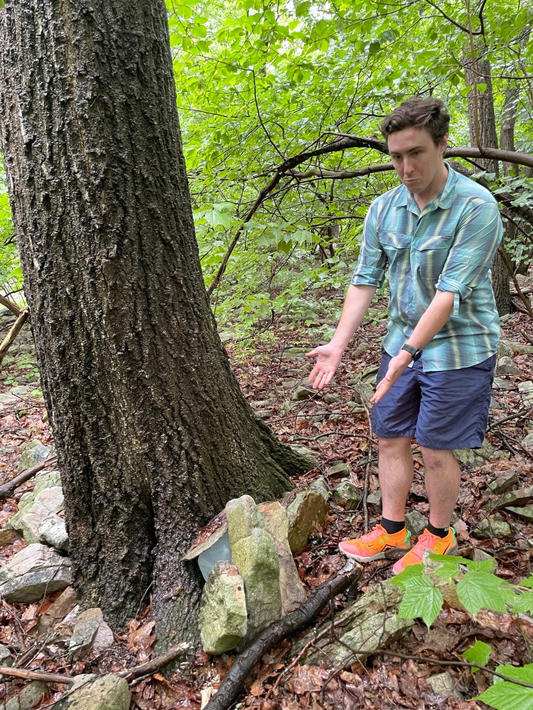 We noted in a shelter log book that a previous hiker scribbled “this section of trail is TECHNICAL” to describe why he was cutting his anonymous 2019 hike short. We wondered what he meant. PA hiking is nice and all but with 2,000 foot ridges “technical” didn’t seem like the right word to use for anything in the region. We woke at our little mountain campsite and made our way first to a stream we all had to use a little creativity to find (the hemlock glade was great; we survived Sarah’s hose water!) We ended up completing a few miles that were supposed to be part of the previous day’s route we decided in advance to cut short to avoid a 24 mile resupply day. I am more than glad we opted not to do these miles tired and at the end of a long march. Technical became a thing indeed. The path down into Fowlers Hollow was impeded by enormous fallen trees. I’m pretty sure they were gigantic Ash trees killed over the last ten years by the Emerald Ash Borer and then knocked down by storms but I couldn’t tell for sure. Either way, they were huge and they were in our path, forcing “technical” bouldering skills to go over or under. At Fowlers Hollow Shelter itself we were in for another surprise: a big porcupine had decided to call it home.