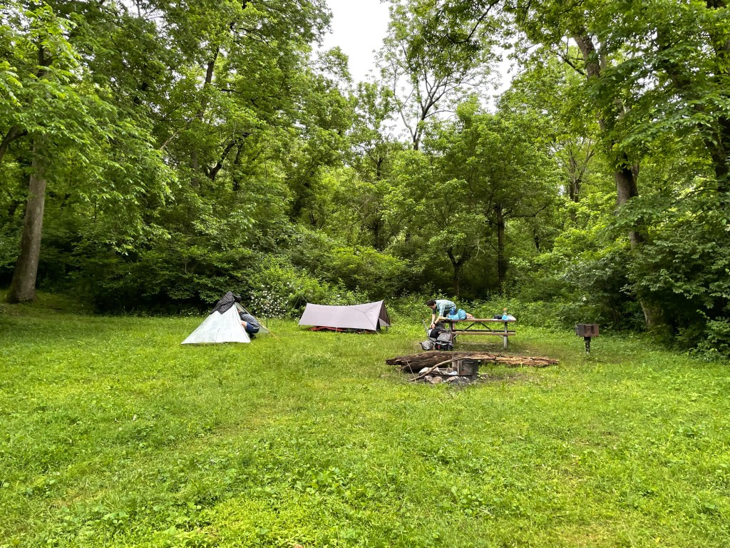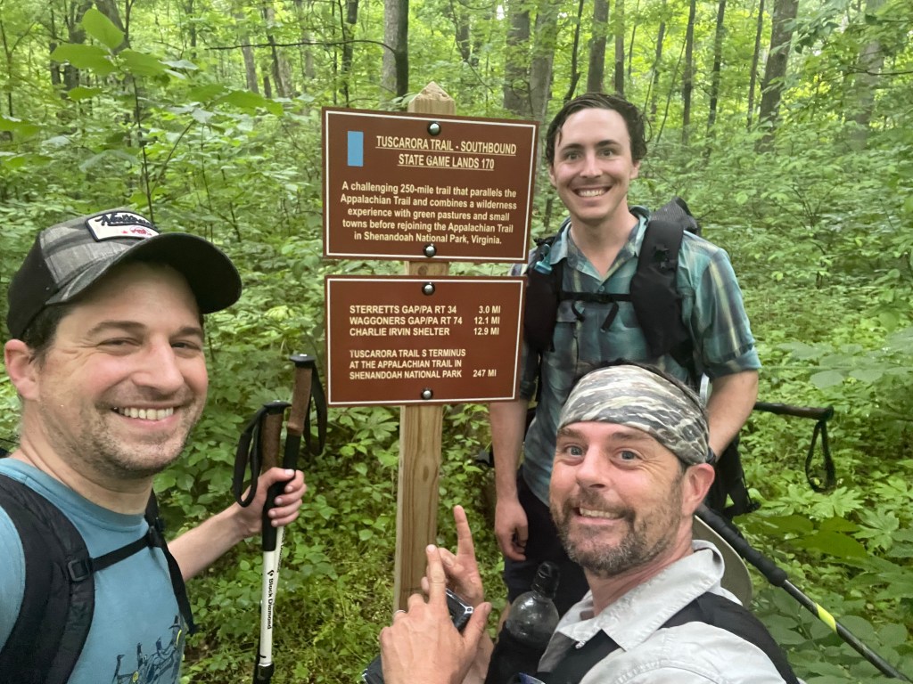 Intro. No more weekend warrior section hiking for us. We graduated to whole week warriors for the final 115 miles of the Tuscarora Trail — and threw on another 10 miles on the Appalachian Trail to boot so we could rock out with thru-hikers on our last night (and, you know, get back to our car). It was fitting that Claudio, Kyle, and I, or, as we signed at trail registers throughout the week, Tarzan, Water Dog, and Whiskey Fairy — the Three Shakes Gang — completed this section hike together. The plan: an 8 mile Saturday and 10 mile Friday to begin and end the trip, and five days averaging 20 miles to zip along the various ridges of the Pennsylvania Tuscarora Trail. The highs: near perfect weather for late May/early June, great trail camaraderie and drinks (schlepped, cached, and procured en route), and a fine selection of nature, history, and PATC shelters to lift the soul. The lows: slippery, torturous, slow-going stretches of rock at times and an occasionally overgrown trail snarling at our legs and sense of direction — that and a couple stretches where we had to carry upwards of 6-7 liters of water a piece. The end: a glorious week of hiking and a completion of our 2021 Tuscarora Trail section hike. [Our trip corresponded to sections 1-10 as organized in the PATC’s Tuscarora Trail guide.]
