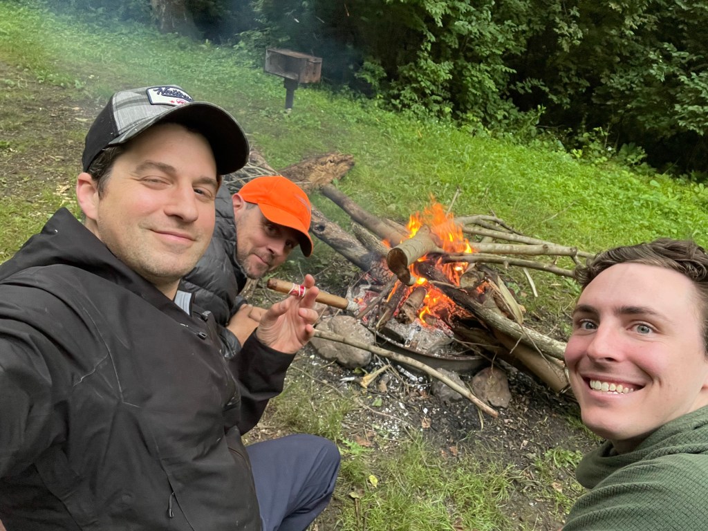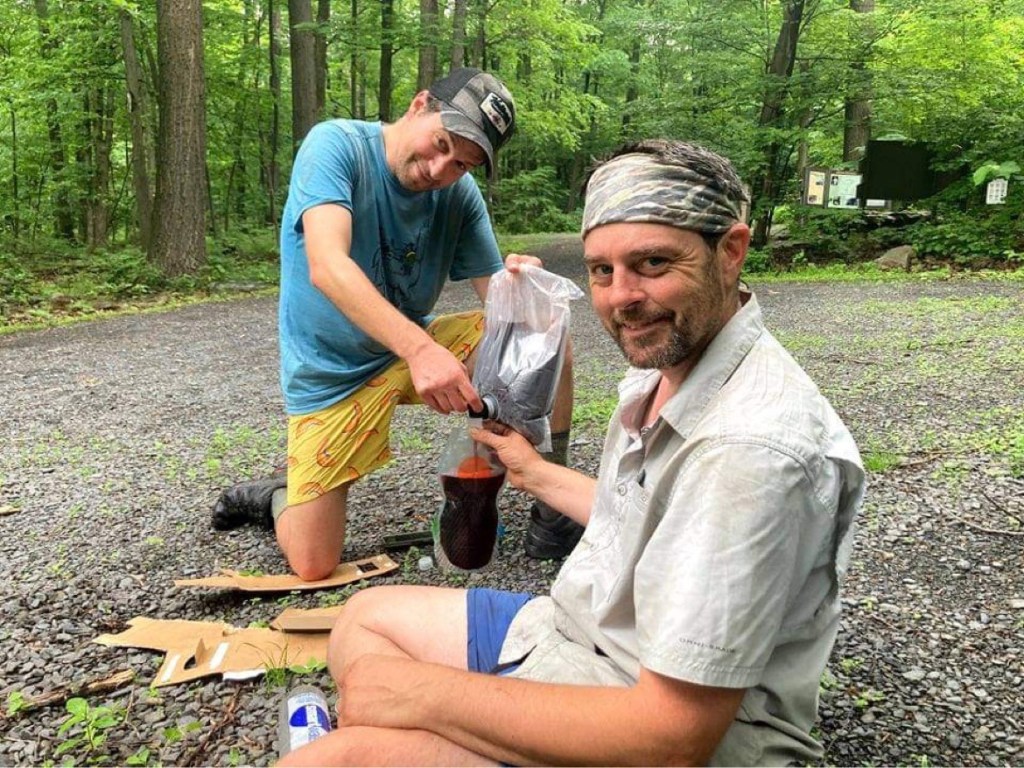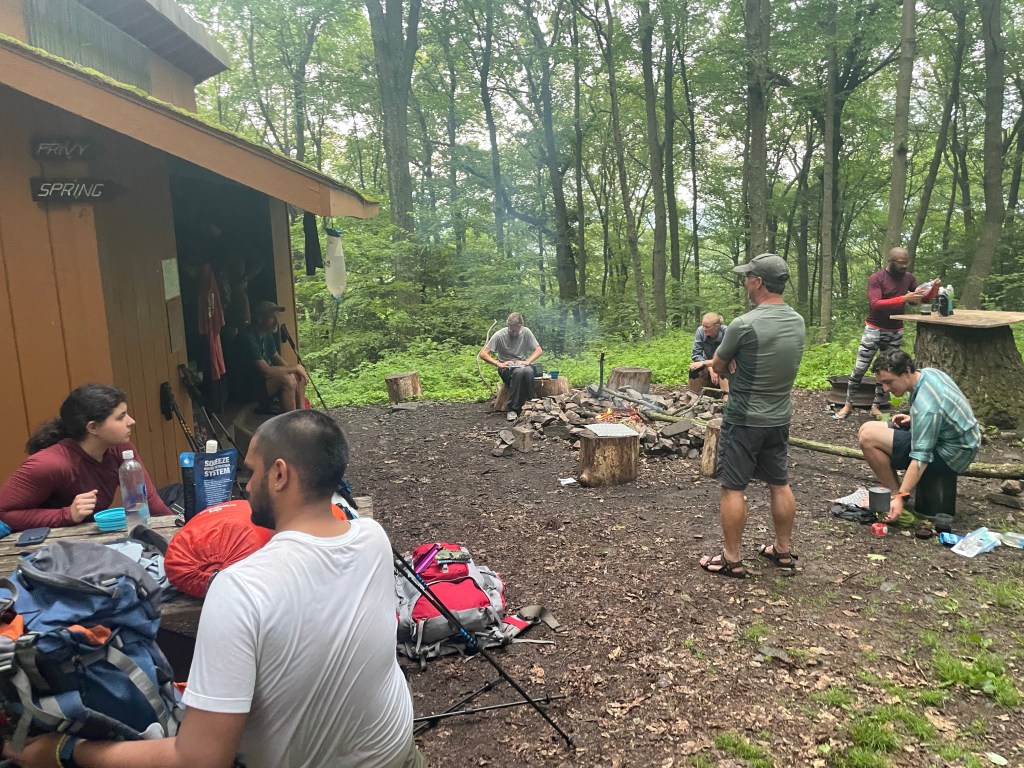 Some things really do come together nicely. We planned the daily splits for the trip around a few key areas: resupplying in Spring Run, hitting shelters when possible, and ending our final full day at the intersection of the Tuscarora and Appalachian Trail to stay near the Darlington AT Shelter. We knew we were likely to see a bunch of NOBO AT thru-hikers rolling through on their way to Maine — and we definitely wanted to hang with them and provide a little trail magic wine. Claudio, a NOBO AT 2017 thru-hiker himself, reminisced about the AT with folks as Kyle and I cosplayed and tended bar on a big stump. Our wine and whiskey were a hit. There were probably about a dozen thru-hikers and section hikers in or near the shelter joining the festivities. It was everything we hoped for. We met some great folks and had some fun conversations. (Note: talking about favorite snacks is a hit, but musing about Gen Z sexual predilections, not so much.) All was good, even though I inadvertently mixed whiskey with wine in Maverick’s cup while tending bar. I thought his titanium mug was empty!