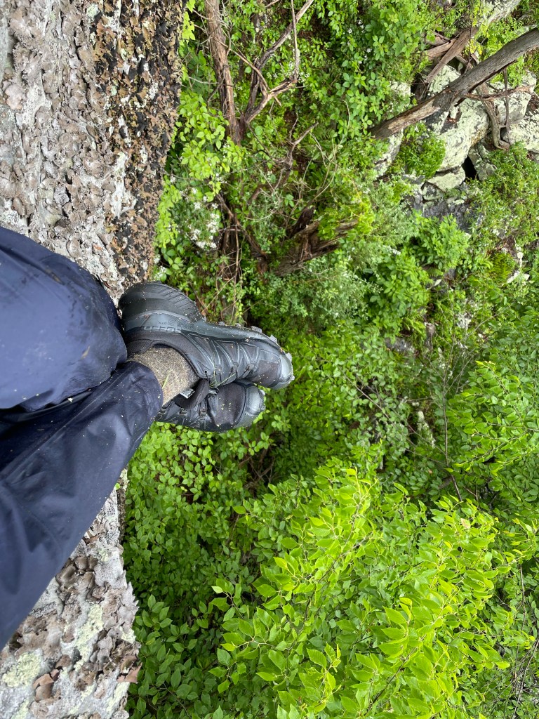 Knob Mountain was pretty, actually. And despite a number of blown down trees here and there — that fell pretty recent as a result of the same big storm — was blazed well enough. But it did seem to go up and up for the entire nine miles, which made little logical sense for a ridge that capped out at 2,300 feet on paper. Emotionally, though, it kind of felt like a 46er. But in the end our campsite on adjoining Rising Mountain was lovely, Claudio got a great little fire going, and we enjoyed another evening of whiskey and recovery. Our stretching/rolling of our feet ritual was really paying off — or so we kept telling ourselves as our beat up bodies were doing their best to heal up each night.