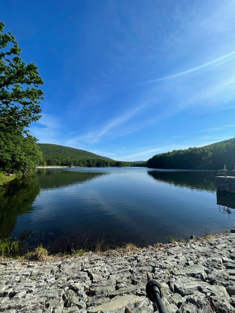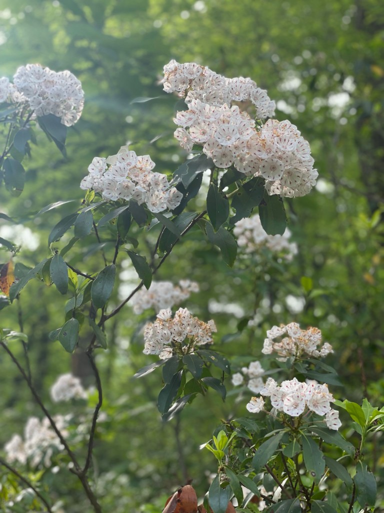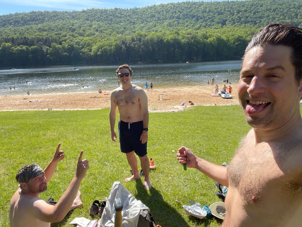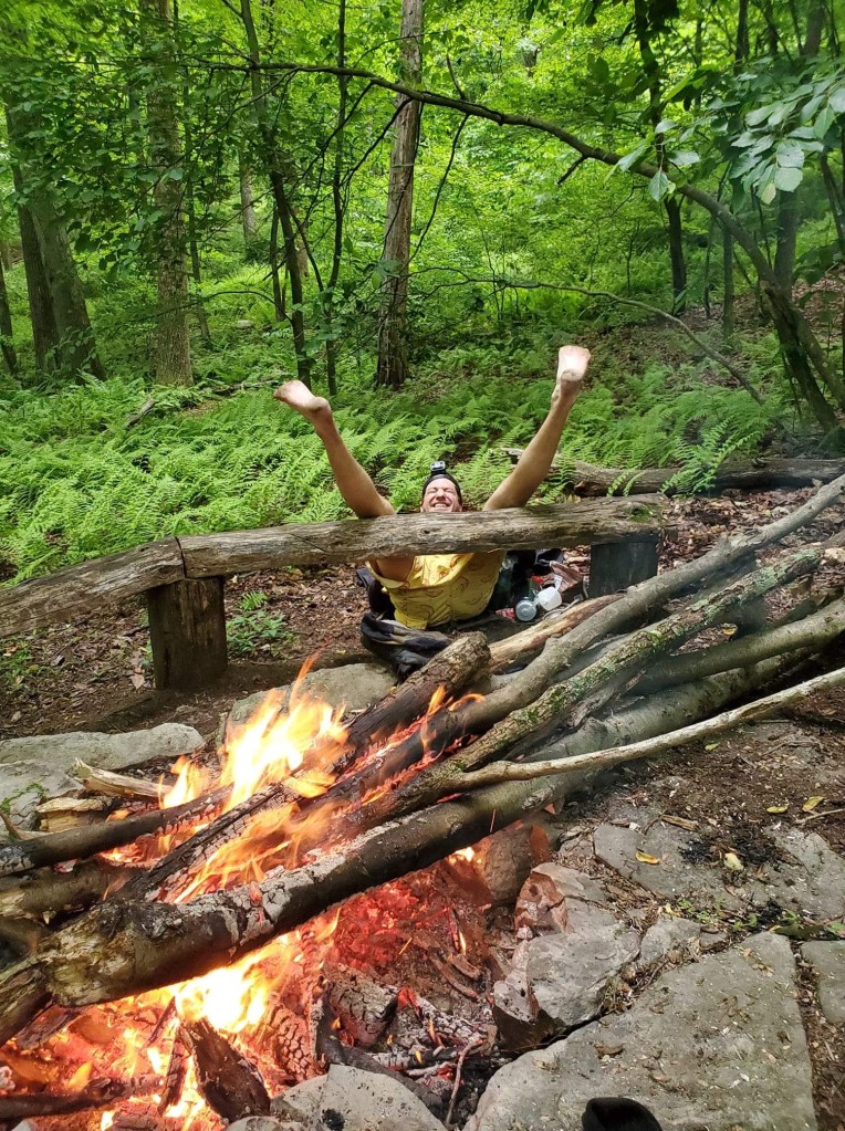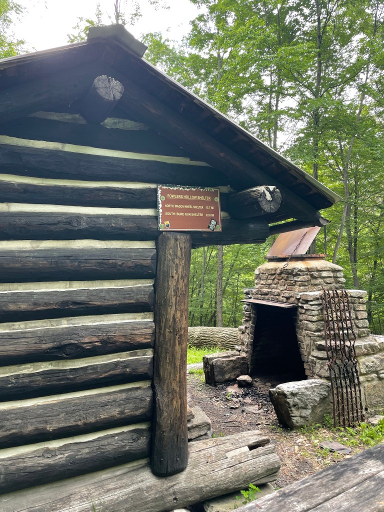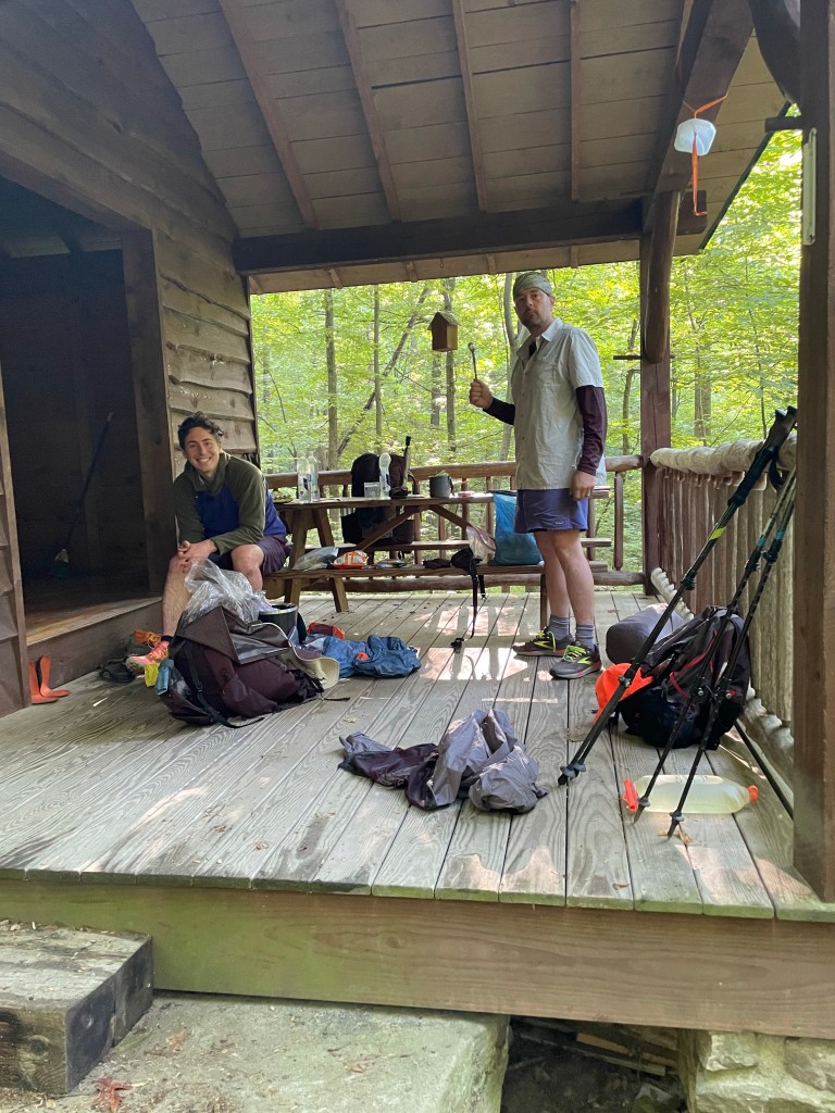 We pounded out another number of miles over the gorgeous, mountain laurel-blooming ridge tops near Cowans Gap State Park before rolling through its rather crowded lake swimming area. I showed up a bit later than Claudio and Kyle (which was the usual — I think they were hiking a half-mile per hour faster than me throughout the week) and nabbed Kyle’s — and our group’s — last $5 in cash to grab a chili cheese dog. They snacked on Caesar wraps. We all swam a bit and enjoyed the scene. But, alas, we needed to push on a few more miles to reach our shelter abode. We were feeling pretty beat when we got there. Fire, beer, and whiskey flowed and helped, though. Of note for Burd Run Shelter: there was so much scattered fallen wood debris around the shelter and fire ring area that it was crystal clear it had been a long time since the last campfire there. There’s an unused beauty to the shelters of the Tuscarora.
