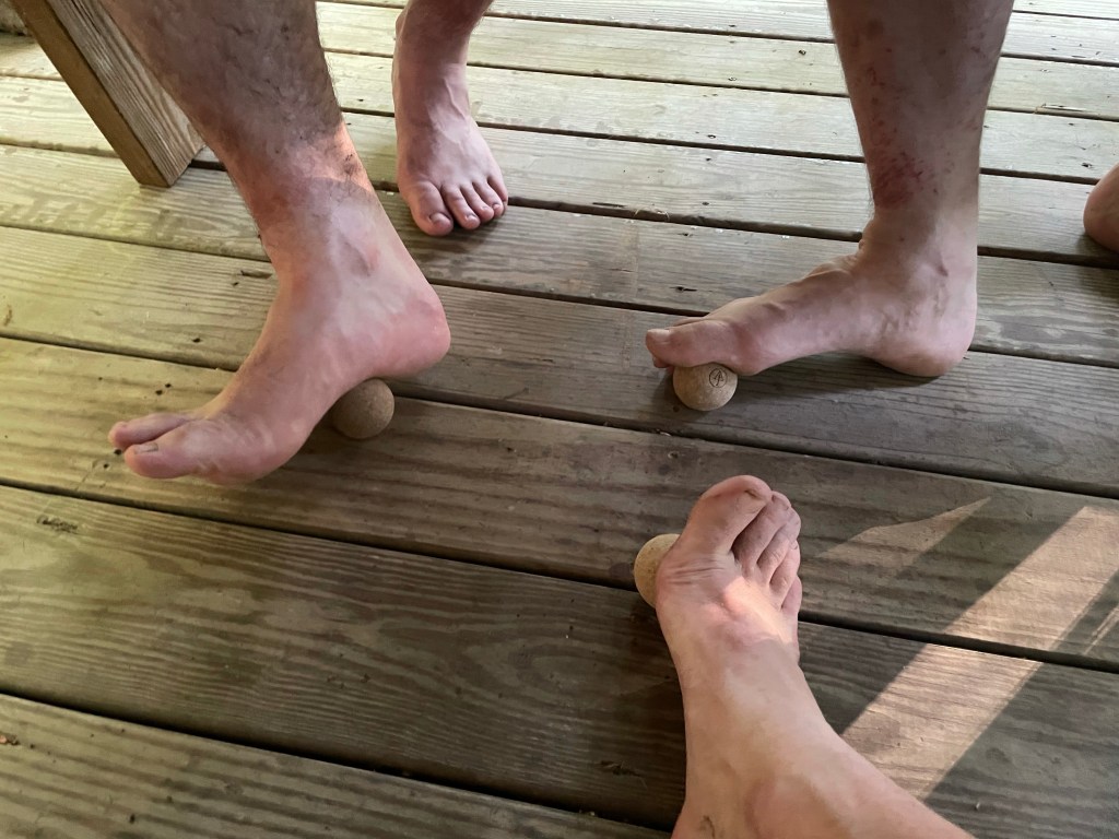 It wasn’t raining on us as expected but it was pretty cool and overcast for much of the day. Our first nine miles of the day were “country road” scenic and flat until we began to ascend the dry and rocky ridge that would be our playground for many miles. On the ridge we got our first taste of overgrown trail. I was happy to have rain pants to act as shielding. Claudio and Kyle smiled as they pushed through briar with bare legs. Our home for the night was the very pleasant Reese Hollow Shelter, whose only flaw was being located a mile off trail with a steep descent. It was a brisk 21 miles for our day total. We started a little shelter stretching routine for the week, complete with official calming Max Richter piece I played on my iPhone while we loosened up our calves, quads, hamstrings, and glutes, and we even all pulled out matching Rawlogy cork massage balls to give our feet some love. Not a bad little tradition. We also celebrated with another roaring fire and whiskey. I got a little giggly and couldn’t quite maintain balance while sitting around the fire . . .