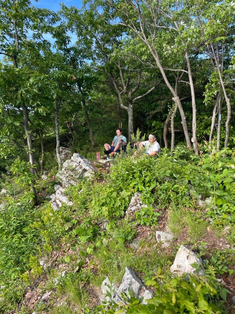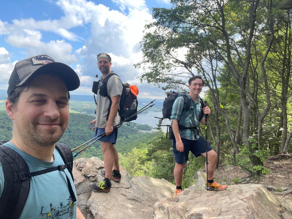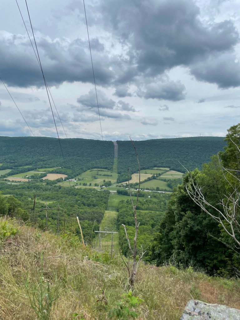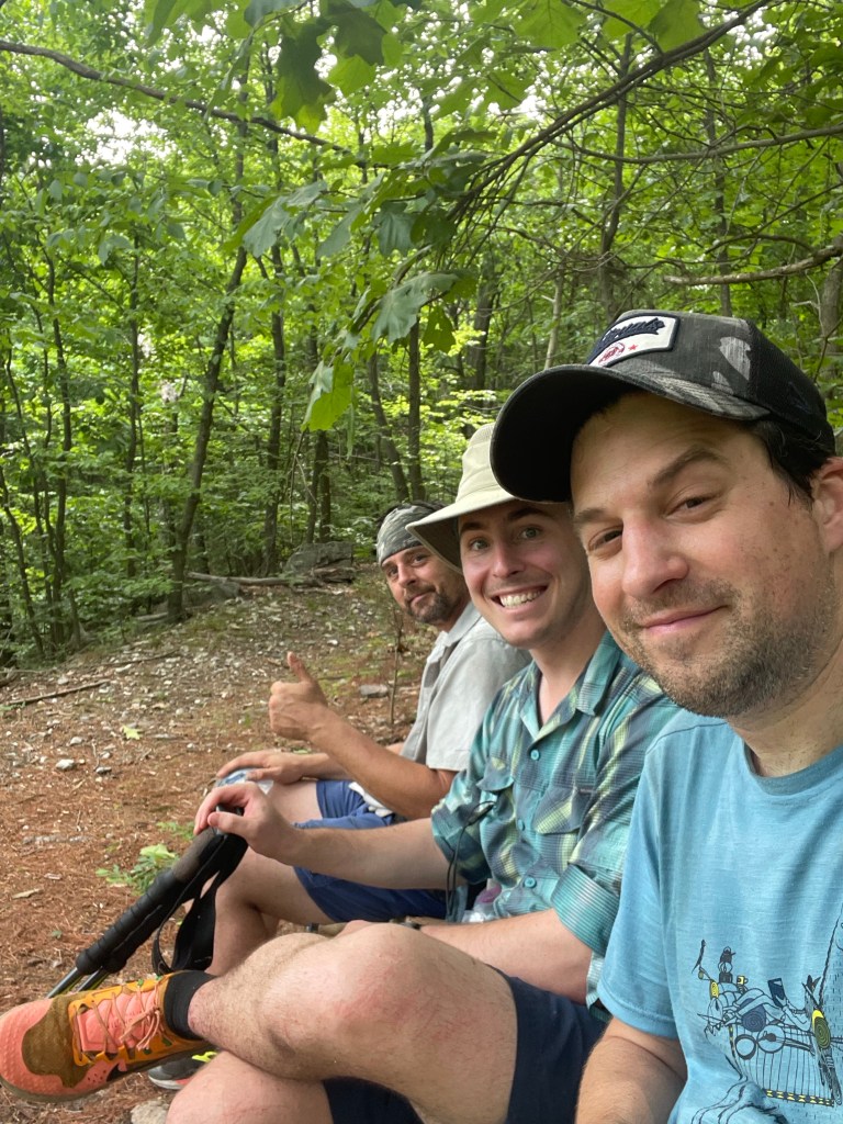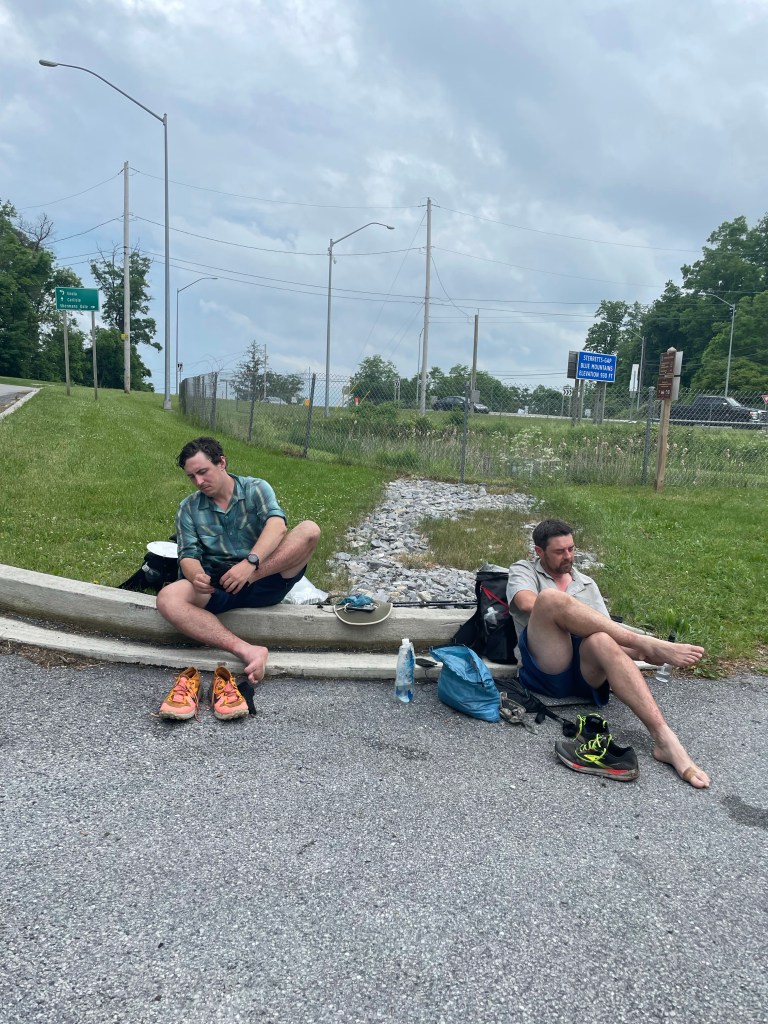 Our mood picked up when we met up with our water and wine cached days earlier at Waggoners Gap, though we did have another 12 or so miles to go for the day. The trail eventually turned from a rocky mess back to a normal-ish trail. It even gave us another burst of fun ridge-to-town Pennsylvania enjoyment when it dropped into Sterrets Gap — including a significant descent down a powerline clearing — and forced us alongside a busy highway before eventually heading back up a ridge for the very final Tuscarora miles. After not seeing Claudio and Kyle since the wine cache, I was happy they decided to take a long break to dry their feet out and wait for me to catch up so we could finish the Tuscarora together. The final few miles were actually blessedly rock free along a pleasant grade. (We joked that someone starting southbound might smile with such a fine bit of trail and be in for a rude awaking on the rocky ridge waiting for them after Sterrets Gap.) What started for the three of us as a snowy, frozen slog in February ended as a sweaty, slippery mess in June. Which, in the mid-Atlantic, sounds just about right.