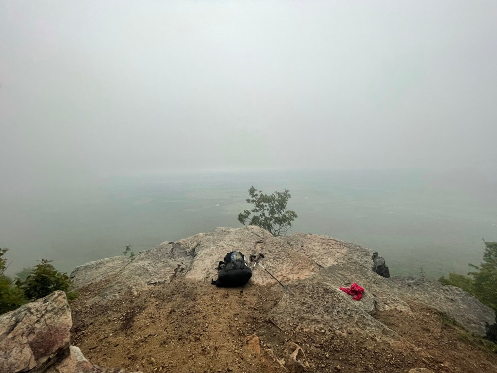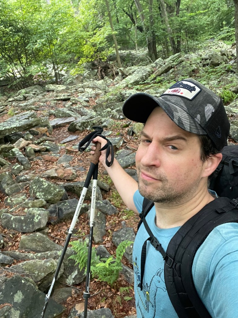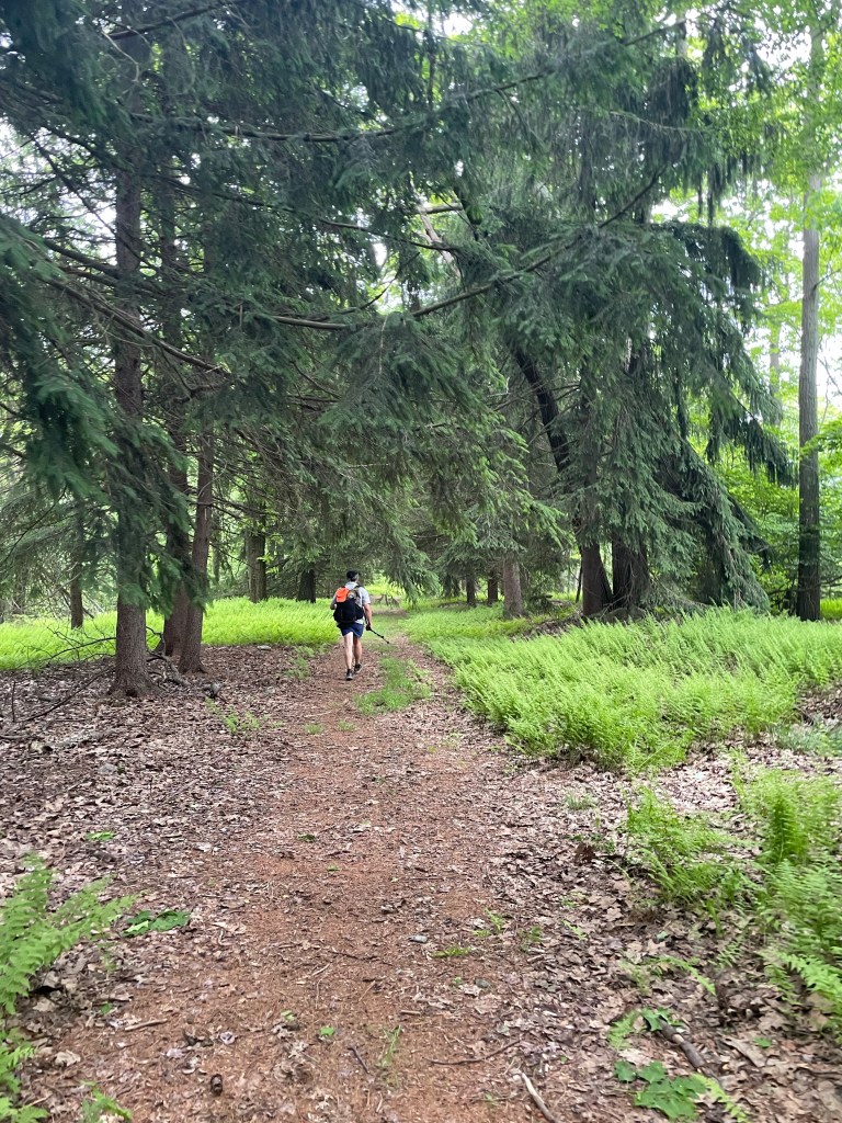 Sure, stopping short a few miles one day is all well and good. But those miles need to get added on somewhere. So we woke up and set out to do 23 miles on our last full day on the Tuscarora Trail. Sounds easy, right? Well, you see some of these miles were the most difficult of the entire week. After a lovely morning skipping alongside ferns, the trail got pretty rough. The rain of the night before — and some brief showers throughout the morning — made the rocks of the trail pretty slick for footing. And for several miles leading to Waggoners Gap and a few miles after it too, overgrown stretches of the trail combined with rocky, slippery footing to pose quite the challenge. Claudio and Kyle ended up far ahead of me as my pace slowed down dramatically to avoid smashing my feet into rocks or taking an unexpected tumble. I never fell per se, but my feet slipped and collided with a number of rocks, leading me to occasionally scream “red card!” to note my bruising displeasure. On more than one occasion I had to fully stop amongst the bushes and trees and look around me for several minutes to make sure I was on the trail. For a time, I fell into a Zen-like mantra of “stay upright, stay on trail” to push me through it. It was also an opportunity to remind myself that I took my only week of leave all summer to slam my foot into rocks as branches lashed my face. So I smiled in spite of it and kept on keeping on. Claudio and Kyle waited for me at the gorgeous Charlie Irvin Shelter (seriously, I don’t know of a better shelter with such a panoramic view) after the worst of the stretch to make sure I was still alive. I was. So were they. The only casualty ended up being one of Kyle’s trekking poles, which gallantly took one for the team shattering into many pieces to save Kyle from a fall.