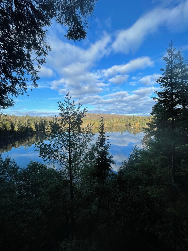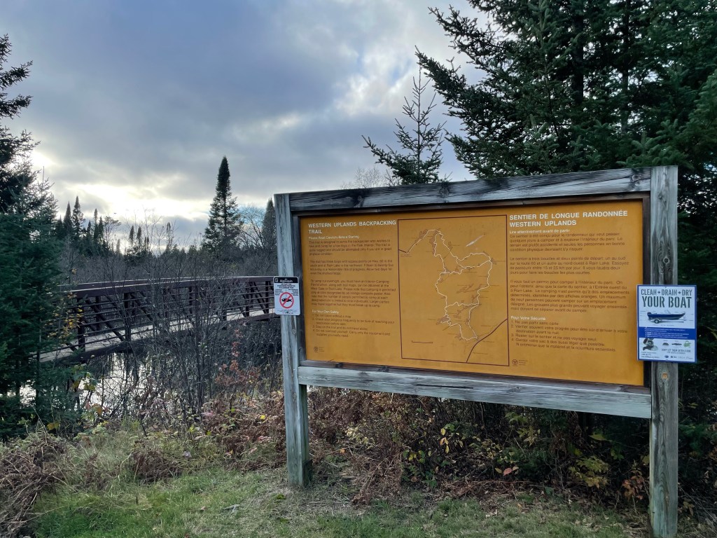 For Ontario backpackers interested in a 50 mile (80 kilometer) trail, Algonquin Provincial Park’s Western Uplands Backpacking Trail is one of the few backcountry options available. I hiked it in two nights and two days October 22-24 with rough splits of 5 miles (8 km) on Friday afternoon, 26 miles (42 km) on Saturday, and 19 miles (30 km) on Sunday. In short: the lakeside campsites were amazing (as well as numerous) and the remote wilderness feel of the well-blazed footpath exemplary; actual trail conditions on the ground, however, were extremely wet and muddy — including a few challenging stream crossings. All of the available signage and official descriptions of the trail kept referring to it as “rugged” so I guess that’s what was meant.