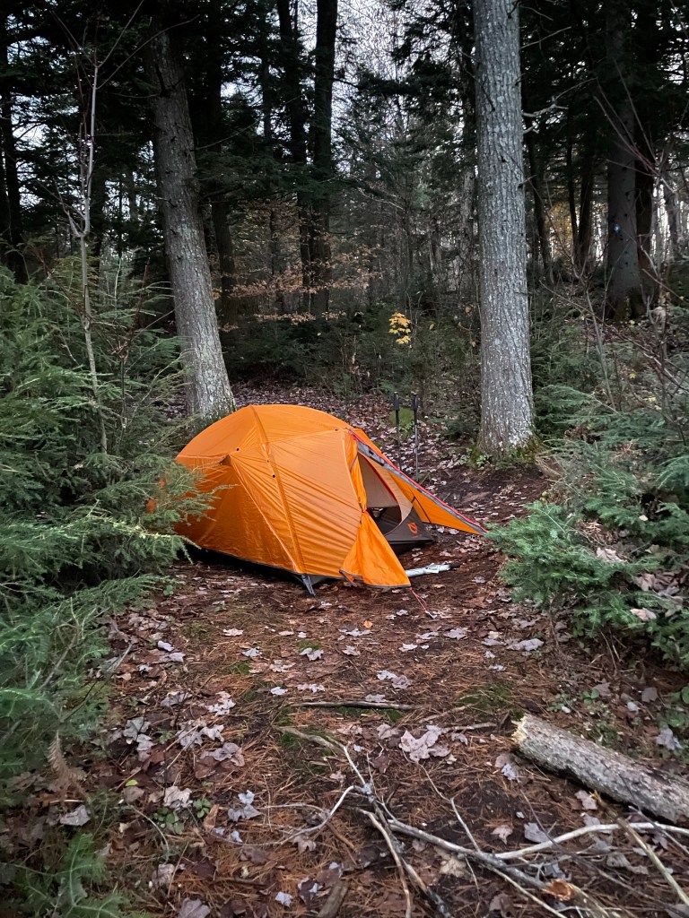 By nightfall I was pulling into my campsite at Ramona Lake and feeling like the woods were all mine for the weekend. Snow flurries continued to swirl sporadically but not with enough precipitation to actually stick. I heard a loud crack in the woods and paused, knowing immediately that it would take a rather large animal to make that kind of sound. When I turned my headlamp off and paused to take in the woods and listen to my surroundings, I eventually saw the telltale dot of light through the woods indicating another campsite. I assumed the crack was a human or two foraging for firewood. I myself opted for no fire. I was tired and happy to settle in after dinner into my robust full-service tent — a rarity for this UL backpacker accustomed to tarps and single wall, trekking pole-hoisted shelters. As I figured out backpacking in Ontario, my wife would be more comfortable knowing that my solo Canada adventures would involve me overnighting in a tent designed to handle serious wind and snow. I debated whether or not I would tell her about my sleeping pad oversight.