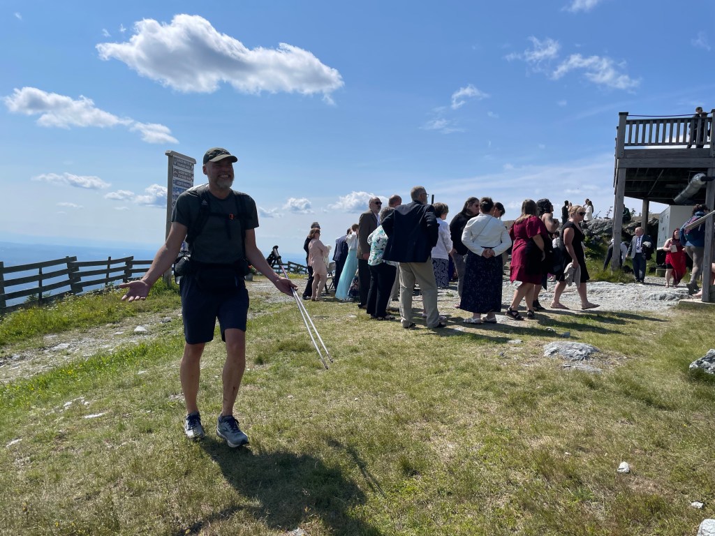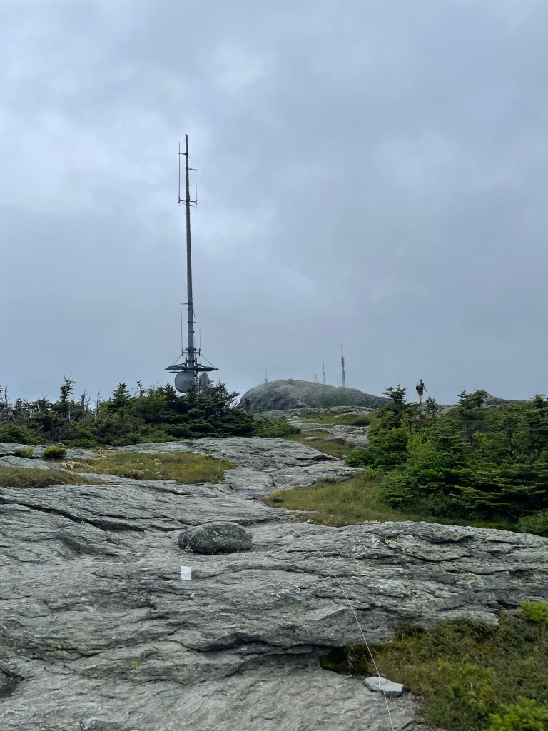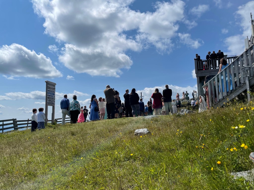 Sure enough, I saw a crowd milling about the summit. Cocktail dresses and suits instead of hiking attire. Andrew beckoned me to one side where a ledge of rock gave us a full view of the ceremony unfolding literally on the trail itself. No sooner had I sat down than the procession started in earnest. Bride. 1 Corinthians. Vows. Photographers. Music. Mark’s face popped up on the other side of the crowd. We were completely cut off from each other by the ceremony on the trail itself. The Long Trail over Jay Peak skirts right by a gondola at the summit (what, you thought this crowd walked up several thousand feet?) and a set of fencing blocking off the other part of the ridge. Nothing to do but wait this out. While Andrew and I got a few grumpy looks from the older folks standing close to us, Mark reported that he encountered some younger fun people on his side who even featured him in their wedding ceremony video.